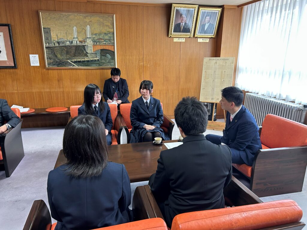 市長からは多くの質問をいただくとともに、「非常に素晴らしい経験をしたことが伝わってきた。今後の学校生活に大いに生かしてほしい」とのお言葉を頂戴しました。