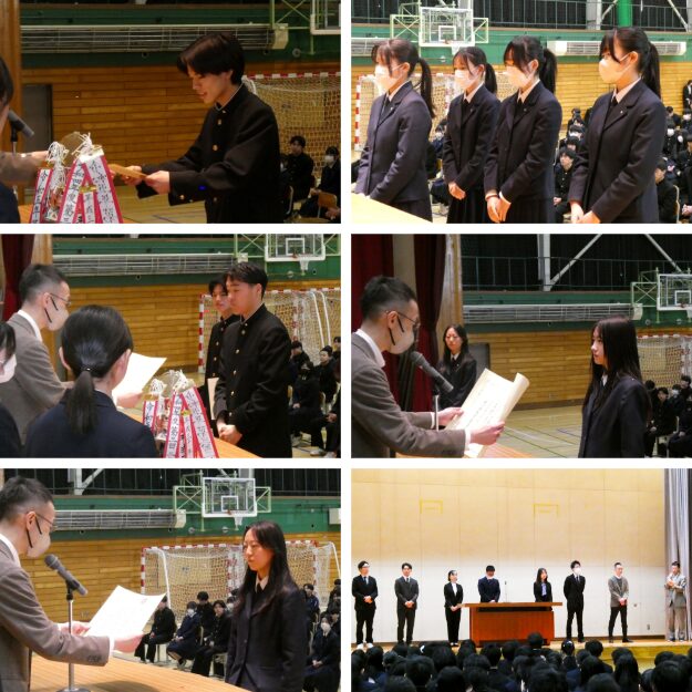 終業式に先立ち、漢字コンクールと部活動全道・全国表彰(書道部・吹奏楽局)が行われました。書道部からは、創玄書道会主催全国競書大会において2年A組の柳沼唯華さんが特別賞である東京都教育委員会賞を受賞、また北海道学生書道展においても2年A組の柳沼唯華さんが北海道新聞社賞、2年D組の井上言奏さんが北海道教育委員会教育長賞を受賞しました。