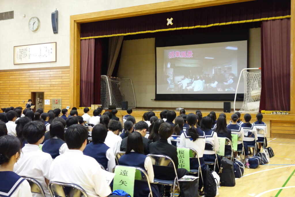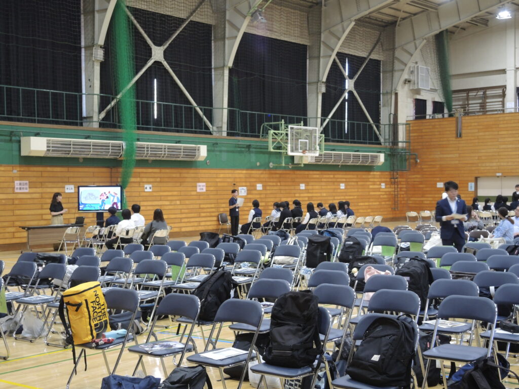 学校紹介動画の視聴や、本校の説明など。まずは体育館で北陽の全体像を掴みます。